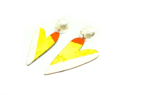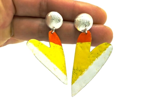 Aros de plata texturados en su base. Corazón esmaltado sobre cobre en tonalidad amarillo, blanco y naranjo.
