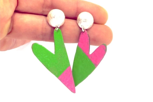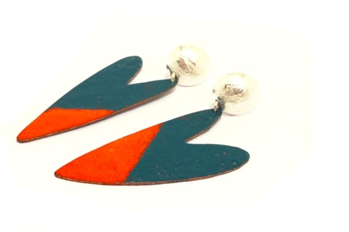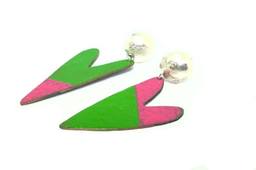 Aros de plata texturados en su base. Corazón esmaltado sobre cobre en tonalidad verde y rosa.