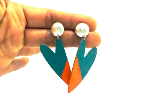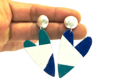Aros de plata texturados en su base. Corazón esmaltado sobre cobre en tonalidad azul, blanco y turquesa.