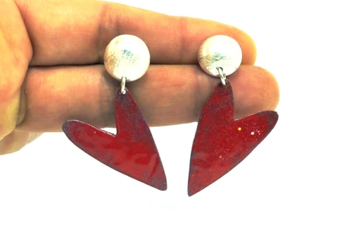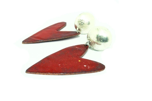 Aros de plata texturados en su base. Corazón esmaltado sobre cobre en tonalidad roja.