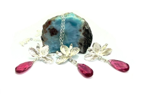 Conjunto compuesto por aros y colgante de plata, modelo flor de loto y turmalinas en color fucsia.