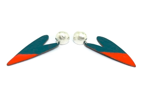 Corazón esmaltado sobre cobre en tonalidad naranja y turquesa.